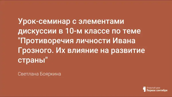 Личность Ивана Грозного - первого русского царя, период его правления вызывают противоречивые оценки писателей, историков, философов, политических деятелей разных эпох. Урок-семинар предполагает большую самостоятельную работу учащихся 10-го класса. Знакомство с произведениями художественной литературы, оценками историков и политиков оставит неизгладимые впечатления, которыми захочется поделиться во время дискуссии.