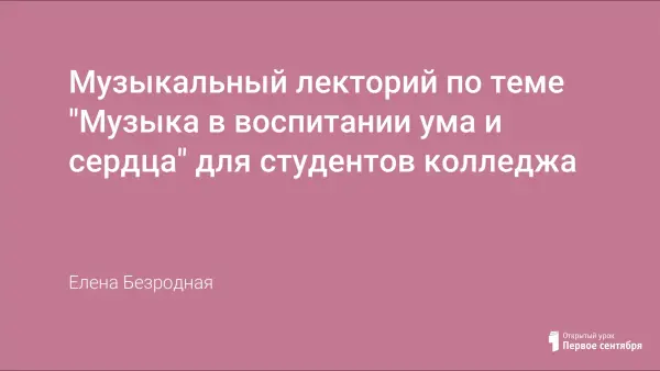 Музыкальная лекция направлена на осознание студентами роли классической музыки в формировании личности ребенка. Раскрываются возрастные особенности восприятия музыкального произведения.Творческая атмосфера лекции-беседы создает ситуацию нового открытия неоправданно забытых форм организации семейных бесед посредством классической музыки.