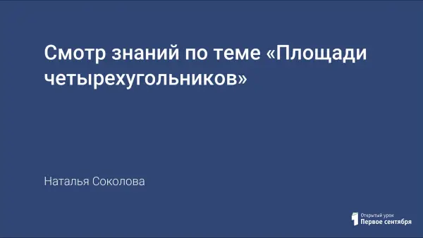 Предлагается вариант смотра знаний по теме «Площади четырехугольников». Повторение теории и решение задач по этой теме особенно важно при подготовке к ОГЭ, так как в экзамен по математике включен отдельный модуль «Геометрия». При таком повторении систематизируются знания учащихся по любой теме курса планиметрии.