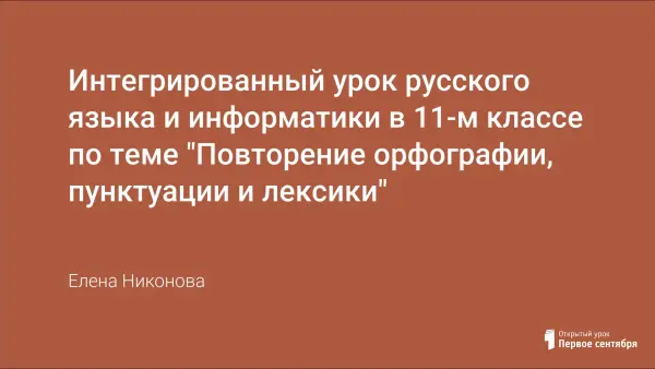 Представленный конспект урока русского языка в 11-м классе (интегрированный с информатикой) по теме "Повторение орфографии, пунктуации и лексики" проводится в компьютерном классе, где все учащиеся имеют доступ к машинам. Учитель русского языка проверяет навыки работы с текстом (деление на смысловые фрагменты - абзацы), орфографическую и пунктуационную грамотность, а также некоторые знания по теме "Лексика"; учитель информатики - умение работать в текстовом редакторе. Учащиеся получают оценки сразу по двум предметам.