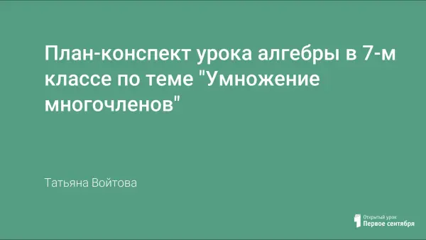 Урок алгебры "Умножение многочленов" является уроком повторения и закрепления знаний, умений, навыков по теме. Урок построен с применением технологии КСО с использованием методики взаимотренажа (ВТр) и методики взаимообмена заданиями (ВОЗ), что позволит решить проблему включенности каждого ребенка в учебный процесс. На уроке формируются коммуникативные способности детей при работе в парах сменного состава (ПСС).