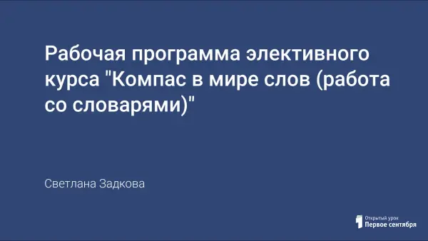Представлена рабочая программа элективного курса "Компас в мире слов (работа со словарями)". Одно из требований, предъявляемых к выпускнику школы, - умение свободно пользоваться лингвистическими словарями, справочной литературой. Предлагаемая рабочая программа элективного курса "Компас в мире слов" позволяет наиболее подробно познакомить учащихся с разными видами словарей, выработать умение осознанно пользоваться словарями разных видов, повысить общую культуру учащихся.