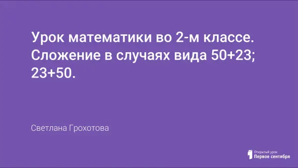 Урок математики во 2-м классе обобщает знания учащихся по теме: "Сложение в случаях вида 50 + 23, 23 + 50", включая в себя разнообразные виды заданий, направленных на развитие восприятия, памяти, внимания, мышления и речи детей; прививает интерес к математике и чтению детской литературы.