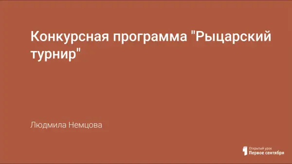 Конкурсная программа "Рыцарский турнир" разработана для организации и проведения досуга обучающихся 6–7-х классов. Может быть использована как мероприятие, проводимое в летнем оздоровительном лагере. В разработку включены разнообразные задания, направленные на развитие сообразительности, смекалки, ловкости, поэтических навыков.