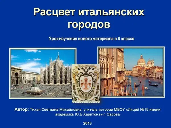 В ходе урока учащиеся повторяют и усваивают местоположение крупных торгово-ремесленных центров средневековой Италии, экономическое и политическое развитие, расцвет итальянских городов в XII‒XV вв., анализируют борьбу гвельфов и гибеллинов, знакомятся с историческим и культурным наследием Флоренции и Венеции.