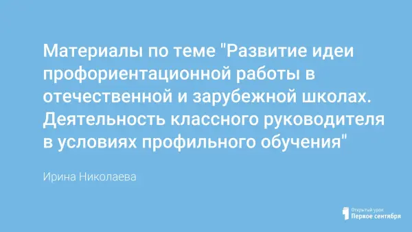 В статье предлагается анализ идей профильного обучения за рубежом и в отечественной школе. Реализация накопленного в этой сфере опыта европейских школ, школ США и Японии с учетом специфики российских условий, экономической ситуации, культурных традиций оказалась возможна в синтезе их идей профориентационной работы. В связи с введением профильного обучения деятельность классного руководителя наполняется специфическими особенностями.