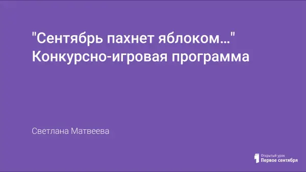 "Сентябрь пахнет яблоком..." Конкурсно-игровая программа – одна из форм проведения традиционного Праздника осени. Содержит не только развлекательные конкурсы и моменты театрализации, но и огромный познавательный материал из различных отраслей науки - истории, языкознания, литературы, этикета и географии. Интересные факты, крылатые выражения, "яблочные" конкурсы помогут сделать праздник увлекательным и насыщенным.