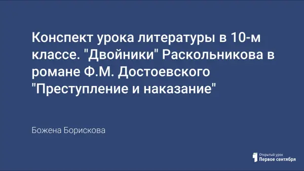 Представленный урок позволяет достаточно глубоко рассмотреть одну из сложнейших тем русской литературы: тему двойничества. Раскрывается она на примере двух героев романа: Лужина и Раскольникова. Учитель показывает, как в мире главного героя переплетаются две противоположные позиции, как отрицательные элементы теории Раскольникова отражаются в сознании его "двойника". Реализуются междпредметные связи, учитель обращается к читательскому опыту учащихся.