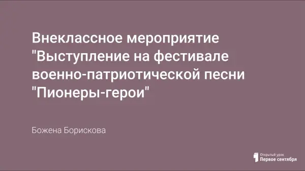 Данное мероприятие проводилось в нашей школе во время традиционного месячника военно-патриотического воспитания в рамках Фестиваля патриотической песни для учащихся среднего и старшего звена. Компьютерная презентация позволила показать зрителям пионеров-героев, их чудом сохранившиеся фотографии, виды городов, памятники героям, их награды.