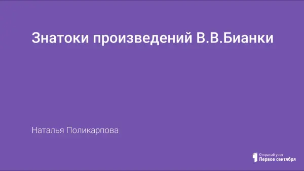 Занятие посвящено жизни и творчеству писателя-натуралиста Виталия Валентиновича Бианки, которого часто называют «лесным корреспондентом», «лесным сказочником». Всё написанное Бианки – это праздник узнавания. Открытия ждут нас на каждом шагу. Книги Бианки помогают найти ключи ко многим тайнам окружающего нас мира. Книги Бианки любимы и детьми, и взрослыми. Они читаются легко и увлекательно. Книги познавательны – много неизвестного о повадках, образе жизни животных. Читая Бианки, мы задумываемся, радуемся, удивляемся.