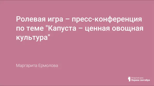 Ролевая игра-пресс-конференция по теме "Капуста - ценная овощная культура". Урок или внеклассное мероприятие проводится в форме нестандартного обучения, пресс-конференции. Это даёт возможность рассмотреть данный материал в расширенном объёме информации, используя игровую технологию. Данный тип урока способствует усвоению и закреплению знаний, так как сами учащиеся становятся активными участниками познавательного процесса.
