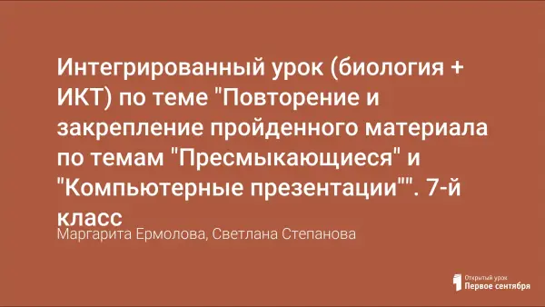Урок закрепляет, обобщает и систематизирует знания и умения, которые учащиеся получили во время изучения темы «Пресмыкающиеся» и «Технология обработки графической и мультимедийной информации». Занятие рассчитано на 45 минут. Во время урока ученики используют разнообразный дидактический и раздаточный инструментарий (карточки, муляжи, ЦОРы, презентации, таблицы, схемы).