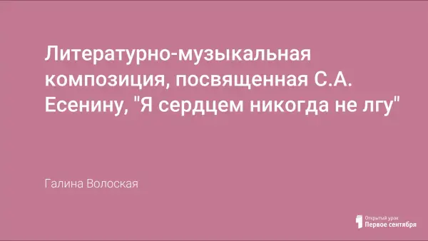 Представлена литературно-музыкальная композиция о творчестве и биографии Есенина. С.Есенин - это один из тех поэтов, чья личная жизнь приковывала внимание многочисленной аудитории. Мир поэзии Есенина - удивительно чистый, светлый, сердечный мир.