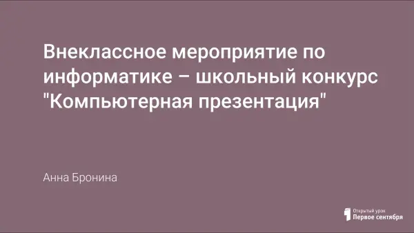 Программа MS PowerPoint – благодатная почва для того, чтобы стимулировать интерес учащихся к предмету. Статья посвящена внеклассному мероприятию по информатике «Компьютерная презентация». В работе представлены: разработанное положение о школьном конкурсе, план проведения мероприятия, бланки «Лист оценки мультимедийного продукта» и «Итоговый протокол». В качестве приложения предлагается одна из конкурсных презентаций.
