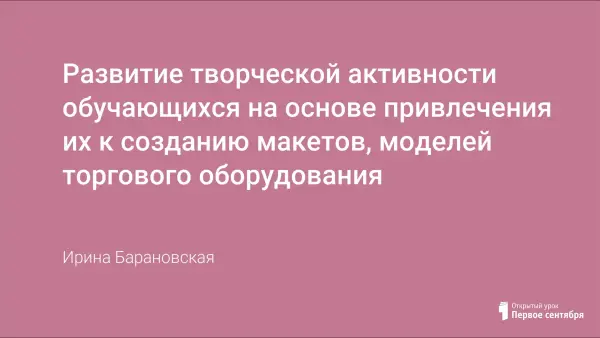 Основная цель профессионального обучения - овладение необходимым комплексом профессиональных знаний, умений и навыков. Разработка и создание макетов и моделей различных видов торгового оборудования обеспечивает наглядность обучения; побуждает обучающихся к осознанному, глубокому изучению материала; развивает техническое мышление и творческую активность; пополняет комплексно-методическое обеспечение кабинета; способствует прочному закреплению приобретенных знаний и умений.