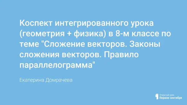 В этой работе предложен один из разработанных мной интегрированных уроков по теме "Векторы" (по учебнику Л.С. Атанасян, В.Ф. Бутузов и др. "Геометрия 7–9" ). Конспекты уроков разработаны так, чтобы подготовить учеников к восприятию и умению применять векторы не только на уроках геометрии, но и на уроках физики.