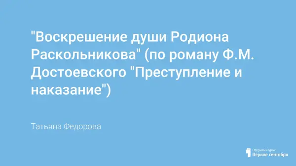 "Преступление и наказание" – один из интереснейших романов Ф.М. Достоевского. Полностью раскрыть характер главного героя, понять его душу помогает эпилог романа, где показывается процесс воскрешения души Родиона Раскольникова. Урок, построенный на основе анализа отрывка эпилога, способствует пониманию ошибочности теории, которая убивает всё человеческое. Благодаря уроку ребята самостоятельно могут прийти к выводу, что любовь и сострадание способствуют возрождению героя.