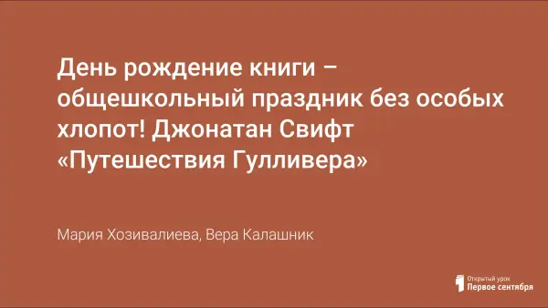 Эта форма проведения внеклассного мероприятия показалась нам – учителю литературы Калашник В.Н. и школьному библиотекарю Хозивалиевой М.П. – интересной для участников, динамичной в проведении, познавательной и стимулирующей к прочтению книги. Придумали мы её сами, сами разработали порядок проведения и провели в нашем Лицее. Для своего мероприятия мы выбрали роман Дж.Свифта «Путешествия Гулливера». Однако выбрать можно любую книгу, по вашему желанию и, учитывая дидактические задачи.
