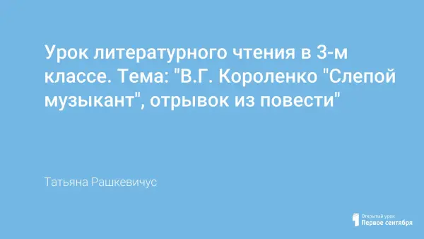 На уроке дети знакомятся с отрывком из произведения В.Г. Короленко «Слепой музыкант». У учащихся развиваются навыки чтения, умение составлять словесный портрет героев. Дети учатся анализировать внутренний мир героев через самостоятельное чтение произведения. На уроке учитель развивает коммуникативные универсальные учебные действия через работу в парах.