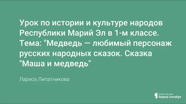 Урок способствует получению и расширению знаний о родном крае, о медведе как персонаже сказок народов, проживающих в Марий Эл. Урок комбинированный. На нем дети читают, рассказывают, поют, лепят. Урок воспитывает любовь и заботу к близким, учит быть сообразительным, находчивым в беде. На уроке используется ИКТ.