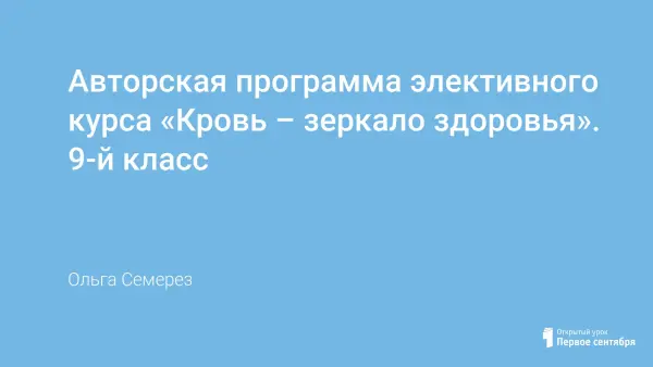 Элективный курс «Кровь – зеркало здоровья» предназначен для учащихся естественнонаучного или химико-биологического профиля обучения. Программа предназначена для учащихся 9-го класса, выбирающих дальнейший профиль обучения в старшей школе. Предлагаемый элективный курс рассчитан на 30 ч.