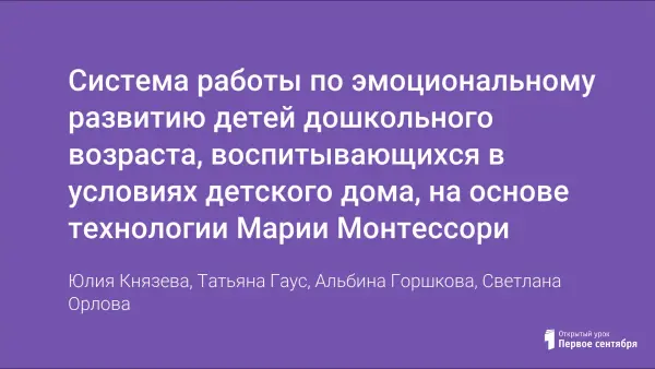 Дети, воспитывающиеся в условиях детского дома, страдают от психической и эмоциональной депривации. Комплексный подход к эмоциональному развитию дошкольников, основанный на технологии Марии Монтессори, обеспечивает эмоциональное благополучие каждого ребёнка, что является необходимым условием всесторонне развитой личности.