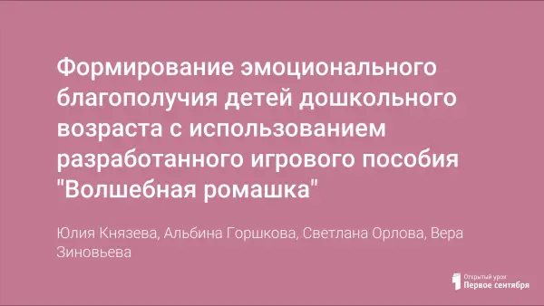 В соответствии с современными тенденциями модернизации дошкольного образования особое значение приобретает проблема сохранения не только физического, но и психологического здоровья детей, формирования их эмоционального благополучия. Систематическое использование разработанного игрового пособия «Волшебная ромашка» в непосредственно образовательной и свободной деятельности детей позволяет обогатить сенсорно-эмоциональный опыт дошкольников, снять их психоэмоциональное напряжение.