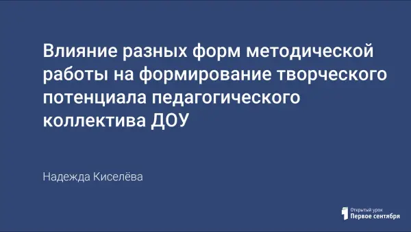 Одной из задач в методической деятельности является создание такой образовательной среды в учреждении, где бы полностью был реализован творческий потенциал педагога и педагогического коллектива. Этому во многом способствует работа коллектива по одному из направлений Госстандарта, приоритету ДОУ, новой интересной теме по работе с детьми.