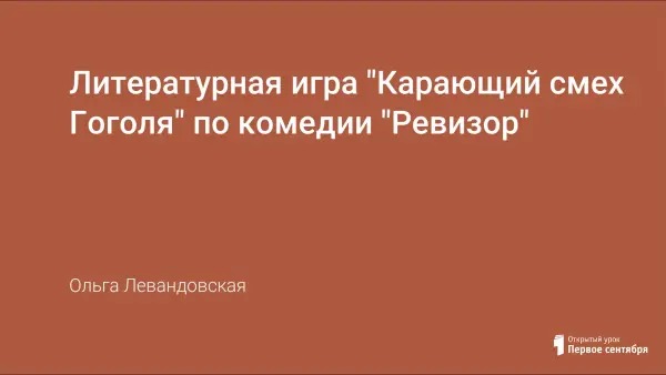 Литературная игра "Карающий смех Гоголя" по комедии "Ревизор" - это урок обобщения и систематизации полученных знаний, проводится после изучения комедии и просмотра спектакля в Малом театре. Игроки делятся на две команды и в каждой сами выбирают капитана. Капитаны тянут задания для своих команд, участвуют в конкурсе капитанов, назначают участников для ответа после обсуждения задания. Задания сгруппированы в 7 блоков.