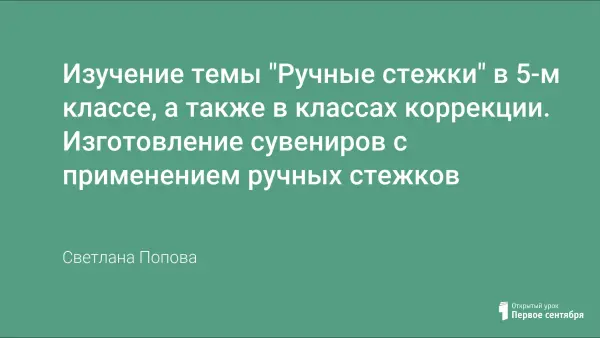 Материал, изложенный в статье, предлагает в увлекательной форме изучить с учащимися 5-х, а также коррекционных классов ручные стежки, которые в обычном исполнении вызывают у учащихся определённые трудности, так как являются первой ручной работой. Выполняя сувениры, учащиеся разрабатывают мелкую моторику рук, особенно важную для детей классов коррекции.