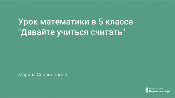 Урок математики в 5-м классе по теме «Давайте учиться считать» проводится в форме игры-соревнования двух команд. Он способствует совершенствованию навыков быстрого и правильного счёта, воспитывает наблюдательность и обоснованность суждений, направлен на развитие познавательного интереса учащихся к предмету.