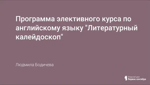 Программа элективного курса по английскому языку «Литературный калейдоскоп». Задача данного курса - развитие навыков устной речи. Преимущество программы заключается в том, что она предполагает интенсивную речевую практику, поэтапность формирования речевых умений, комплексность материала. ТПредназначен для предпрофильной подготовки выпускников основной школы и профильной подготовки в классах с гуманитарным профилем.