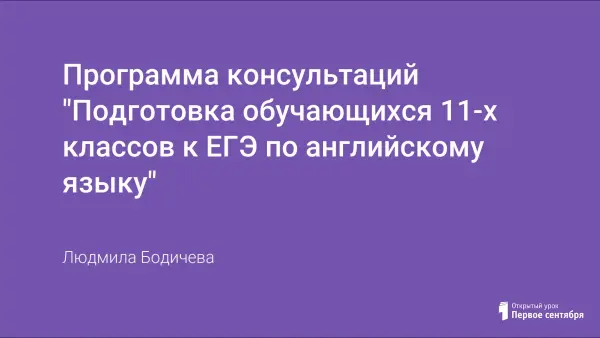 Формат ЕГЭ по английскому языку отличается от системы упражнений, заложенных в учебниках по английскому языку. Это противоречие можно преодолеть за счет введения курса консультаций. Назначение программы - сориентировать старшеклассников в формате, видах заданий, объеме и требованиях единого государственного экзамена.