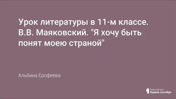 Данный урок литературы в 11-м классе является вступительным при изучении творчества В.В. Маяковского. Учащиеся познакомятся с этапами его творческого пути, основными темами его творчества. Материал урока позволит ребятам познакомиться с личностью поэта и показать на примере стихотворений острое стремление поэта быть услышанным и понятым будущими поколениями.