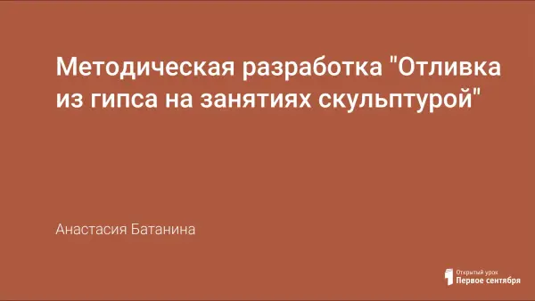 В представленной методической разработке я рассматриваю возможность использования гипса для создания круглой скульптуры на занятиях в школе искусств и предлагаю адаптированную к условиям школы технологию отливки из гипса. Гипс – экологичный, благородный материал, предоставляющий широкий простор для творчества. Работа с гипсом значительно обогащает представления учащихся о предмете «скульптура». Предлагаемая методическая разработка может быть полезна педагогам дополнительного образования при планировании занятий по скульптуре с учащимися 13–17 лет.