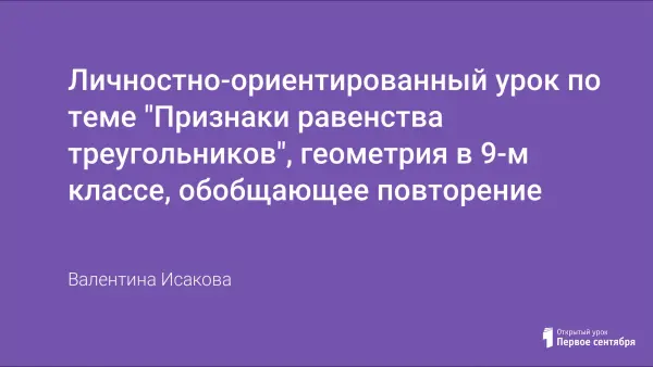 При подготовке учащихся 11-х классов к итоговой аттестации учитель сталкивается с тем, что многие учащиеся боятся решать задания В10, В11 и С4 из КИМов, т.е. геометрические. Поэтому уже в среднем звене учителю приходится обращать внимание на формирование интереса у учащихся к геометрии. Этому способствуют уроки, построенные на личностно-ориентированном подходе к обучающимся. Один из таких уроков в 9-м классе на тему «Признаки равенства треугольников» и предлагается вашему вниманию.
