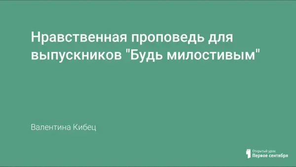 Нравственные проповеди занимают немалое место в духовном развитии школьника нашего лицея. Это попытка разрешить морально-этические проблемы времени, попытка заполнить ту духовную пустоту, о которой предупреждали нас многие писатели XIX–XX веков. В школе проповеди на нравственную тему проходят не часто, так как любая подобная проповедь требует осмысления и духовной работы. Представлена нравственная проповедь для выпускников 11-х классов "Быть милостивым...".