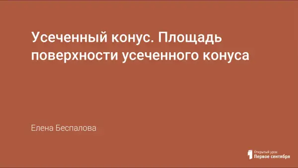На уроке рассматриваются виды сечений конуса различными плоскостями, введены понятия усеченного конуса, его элементов, усеченный конус как тело вращения; выводится формула для вычисления площади боковой и полной поверхности усеченного конуса, показана связь темы с окружающим миром, закрепление нового материала решением задач. Урок сопровождается презентацией.