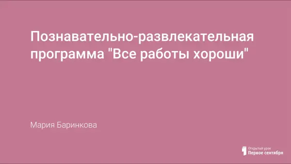 Данной программе предшествовала большая работа по знакомству с профессиями родителей. Мы с детьми ездили на экскурсии в пожарную часть, хлебозавод, АЭС по программе "Энергоснабжение". Подготовили выставку рисунков "Работа моих родителей", написали мини - сочинения "Кем я хочу быть". На мероприятии я представляю теоретический материал и практическую часть в виде игр и конкурсов ("Юные манекенщицы", "Прическа", "Поднять якоря!", "Лучший водитель танка", разучивание комплекса упражнений гимнастики для глаз).