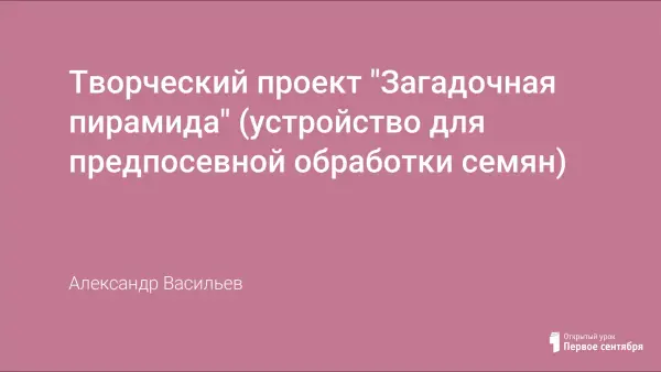 Проект "Загадочная пирамида" является уникальным изделием, созданным на уроках технологии в 8-м классе, который может быть использован учителями химии, физики, биологии, математики, технологии для привлечения учащихся к научно-исследовательской деятельности. Изделие просто в изготовлении, не требует дефицитных материалов и особых навыков пользования им. Опытная работа может проводиться даже в домашних условиях. Кроме того, изделие декоративно и может найти применение в качестве сувенира или подарка.
