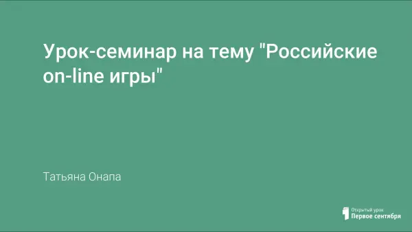 В данной работе представлен продукт работы учащихся на семинаре "Российские on-line игры". Интернет влечет нас и наших детей многими возможностями. И одна из них - игры. Задача семинара - провести исследование на тему существующих российских игр в Интернете.