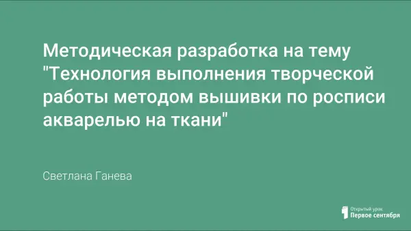Методическая разработка представляет один из блоков дополнительной образовательной программы "Волшебная иголочка" для детей младшего и среднего школьного возраста "Вышивка по росписи акварелью на ткани" и включает пояснительную записку, технологическую карту изделия, фотографии детских работ, выполненных этим методом.