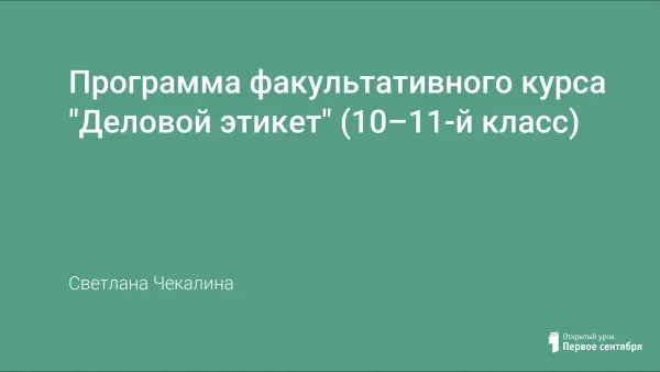 Формирование культуры делового этикета – актуальная задача сегодняшнего дня, и чем более массовый и организованный характер она приобретет в школе, тем скорее наше общество перейдет на более цивилизованный уровень общения. Программа рассчитана на учащихся 10–11-х классов, материал изучается на более высоком уровне, в соответствии со спецификой возрастного и психологического развития старших школьников и их интересами.