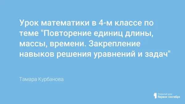 Урок математики в 4-м классе по теме: "Повторение единиц длины, массы, времени. Закрепление навыков решения уравнений и задач" учит вырабатывать самостоятельность суждений при решении разнообразных заданий алгебраического характера, воспитывает культуру труда, аккуратность, развивает память, внимание, потенциальные возможности учеников, способствует привитию интереса к математике.