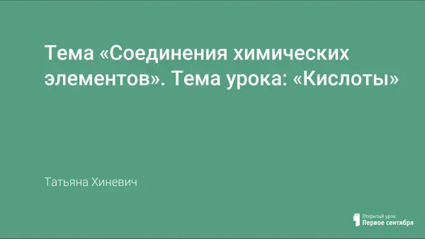 Урок химии в 8-м классе по теме «Кислоты» проводится в форме увлекательного путешествия в мир новых веществ. Такая форма урока, использование ИКТ и проектных технологий, проблемно–исследовательские методы изучения материала, мультимедийная презентация позволяют эффективно достигать цели урока, расширяют кругозор, развивают интерес к предмету, повышают учебную мотивацию учащихся.