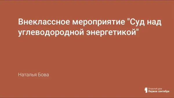 Внеклассное мероприятие для учащихся старших классов в рамках проектов «Водородный всеобуч» и «Альтернативная энергетика». Проводится в форме ролевой игры. Учащиеся знакомятся с историей развития углеводородной энергетики, ее преимуществами, недостатками, проблемами и перспективами. Все выступления участников суда сопровождаются презентацией.