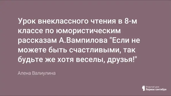 Урок дает возможность не только познакомить учащихся с личностью А.Вампилова и избранными страницами его биографии, но и с ранними юмористическими рассказами на основе активной творческой деятельности ребят. Большое внимание на уроке уделяется и теории литературы (приемы создания комического). В основу технологии урока положена методика продуктивного обучения А.Хуторского, что способствует развитию у ребят креативных способностей, потребности определять смысл своей деятельности.