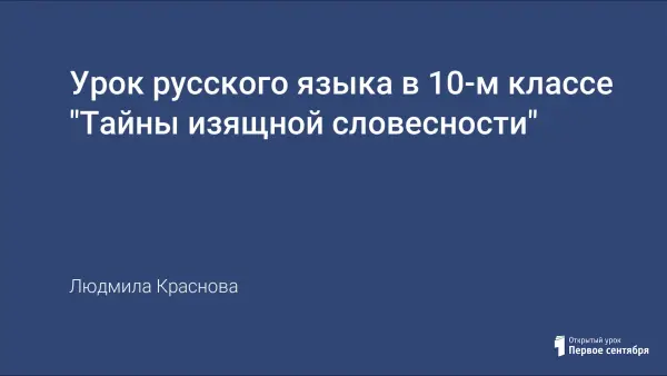 Урок русского языка «Тайны изящной словесности» в 10-м классе – это первый урок при изучении темы «Лексические образные средства». Главной целью является углубление знаний о метафоре, эпитете, олицетворении, также на этом уроке учащиеся знакомятся с метонимией и её разновидностями: синекдохой и антономазией. На уроке работают четыре лаборатории, руководители которых заранее готовят сообщение об одном из тропов, а в ходе их выступлений учащиеся заполняют таблицу «Тропы».