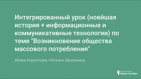 Интегрированный урок по теме «Возникновение общества массового потребления» для 9-го класса построен на основе межпредметных связей по новейшей истории и информационно-коммуникативным технологиям. Проводится совместно учителем истории и учителем информатики. Занятие проводится в форме исследования, которое позволяет учащимся углубленно изучить материал и закрепить навыки работы с информационными технологиями.