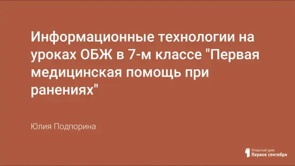 Основной целью урока-презентации является систематизация знаний умений и навыков по теме “Оказание ПМП”. Для достижения данной цели использую современные технологии. Компьютерные технологии, в частности презентации, как наглядные пособия, открывает более широкие возможности для творческого преподавания, помогают учителю излагать учебный материал, развивают навыки наблюдения, обеспечивают прочное усвоение учащимися знаний, повышают интерес к предмету, обеспечивает политехнический принцип обучения.